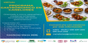 ¿Estás buscando llevar tu emprendimiento al siguiente nivel? ¡Este programa es para vos! En el Centro Pyme de Canelones, lanzamos un ciclo de capacitaciones gratuitas en distintas áreas de la gastronomía, diseñadas especialmente para fortalecer tu negocio y potenciar tus habilidades culinarias. 🌟